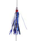 The Clarkspoon Mackerel Duster rig features a blue and silver mylar duster with 1/8 oz head and a size 0 chrome Clarkspoon. The fishing duster is rigged with a 2/0 hook and 45 lb. test black coated wire. There is a barrel swivel crimped on one end of the rig and a coastlock snap on the other end. The coastlock snap allows for easy attachment of the Clark spoon and the leader or mainline can be tied to the barrel swivel.